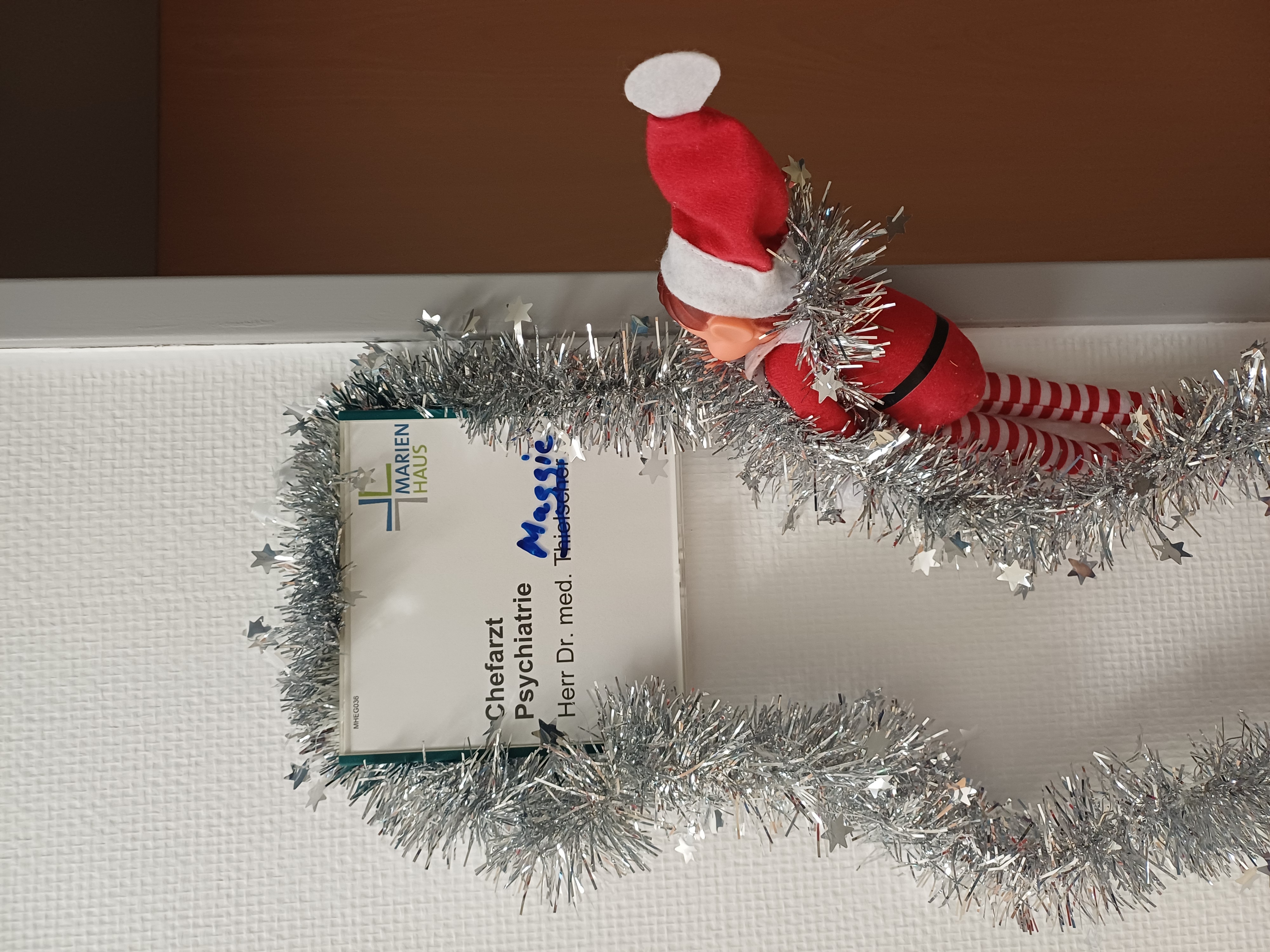 Maggie hat heute offenbar Halt in unserem Marienhaus Klinikum Eifel in Gerolstein gemacht und sich kurzerhand zur Chef-Elfin ernannt. Als wenn das nicht schon genug wäre, hat sie auch gleich das Türschild weihnachtlich dekoriert und das Büro in Beschlag genommen. Du kleine Schelmin!