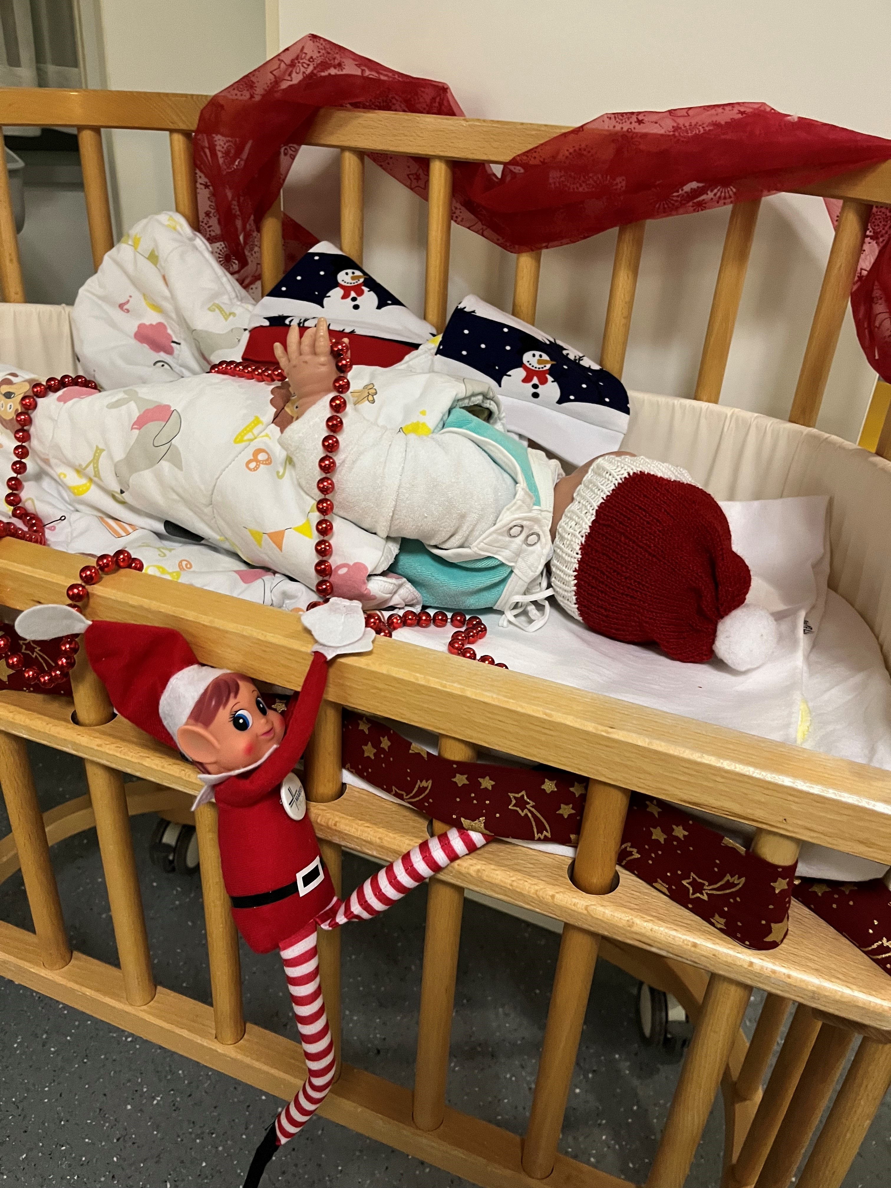 Hoppla! Maggie war wohl der Meinung, dass auf der Mutter-Kind-Station im Marienhaus Klinikum Mainz noch zu wenig Weihnachtsstimmung ist für all die Kinder, die jetzt im Dezember hier zur Welt kommen. Also hat sie kurzerhand begonnen, das nächstbeste Babybett zu dekorieren, bevor sie vom Stationsteam erwischt wurde. Zum Glück lag darin nur eine Übungspuppe, mit der die Krankenpflegeschüler üben können. Die ließ sich durch Maggies Aktivitäten nicht weiter stören.